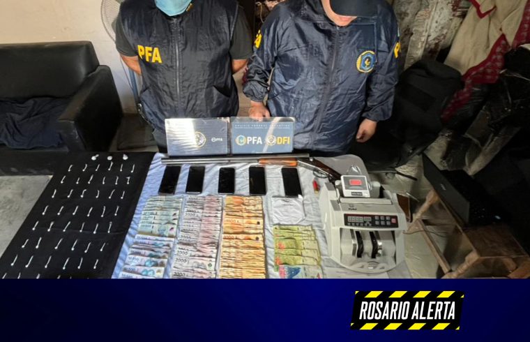 Entre los elementos incautados se contabilizaron dosis de cocaína y marihuana fraccionadas, una balanza de precisión, armas de fuego, municiones, celulares, un automóvil y una suma cercana a los 682.600 pesos, además de una máquina contadora de billetes.